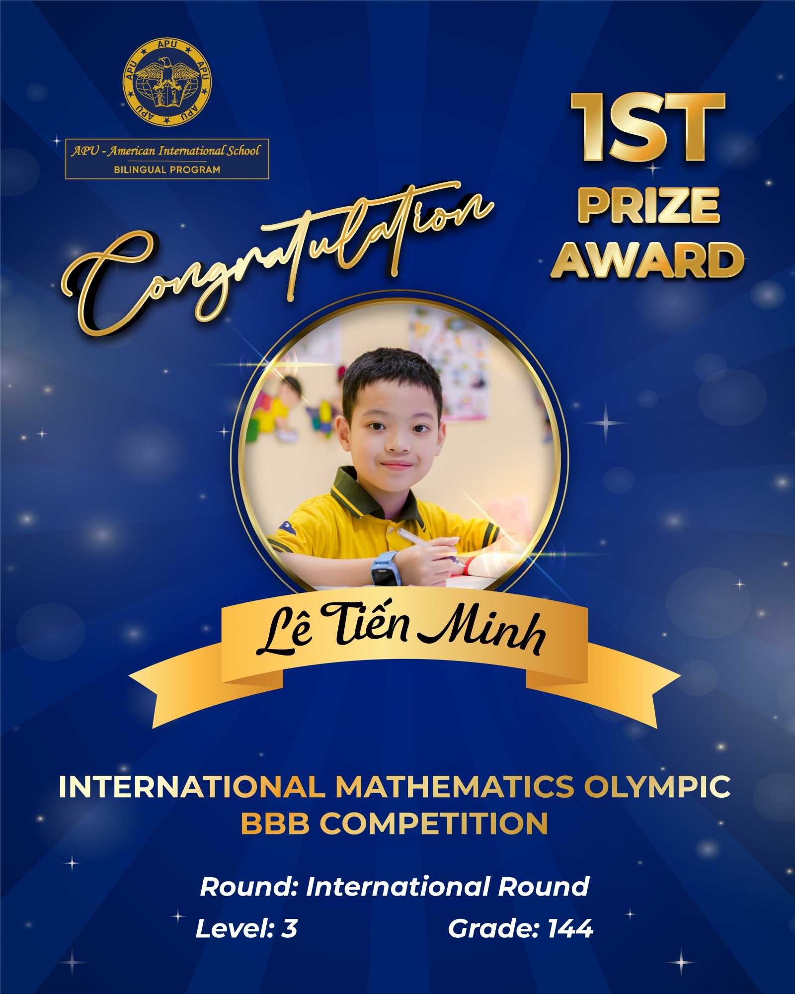 Giành giải Nhất tại Kỳ Olympic Toán học quốc tế BBB ở vòng thi quốc gia, Lê Tiến Minh - học sinh lớp 3 tại Hệ thống trường Quốc tế Hoa Kỳ APU - hệ Song Ngữ lần nữa xuất sắc đứng đầu và mang về Huy chương Vàng ở vòng đấu quốc tế.