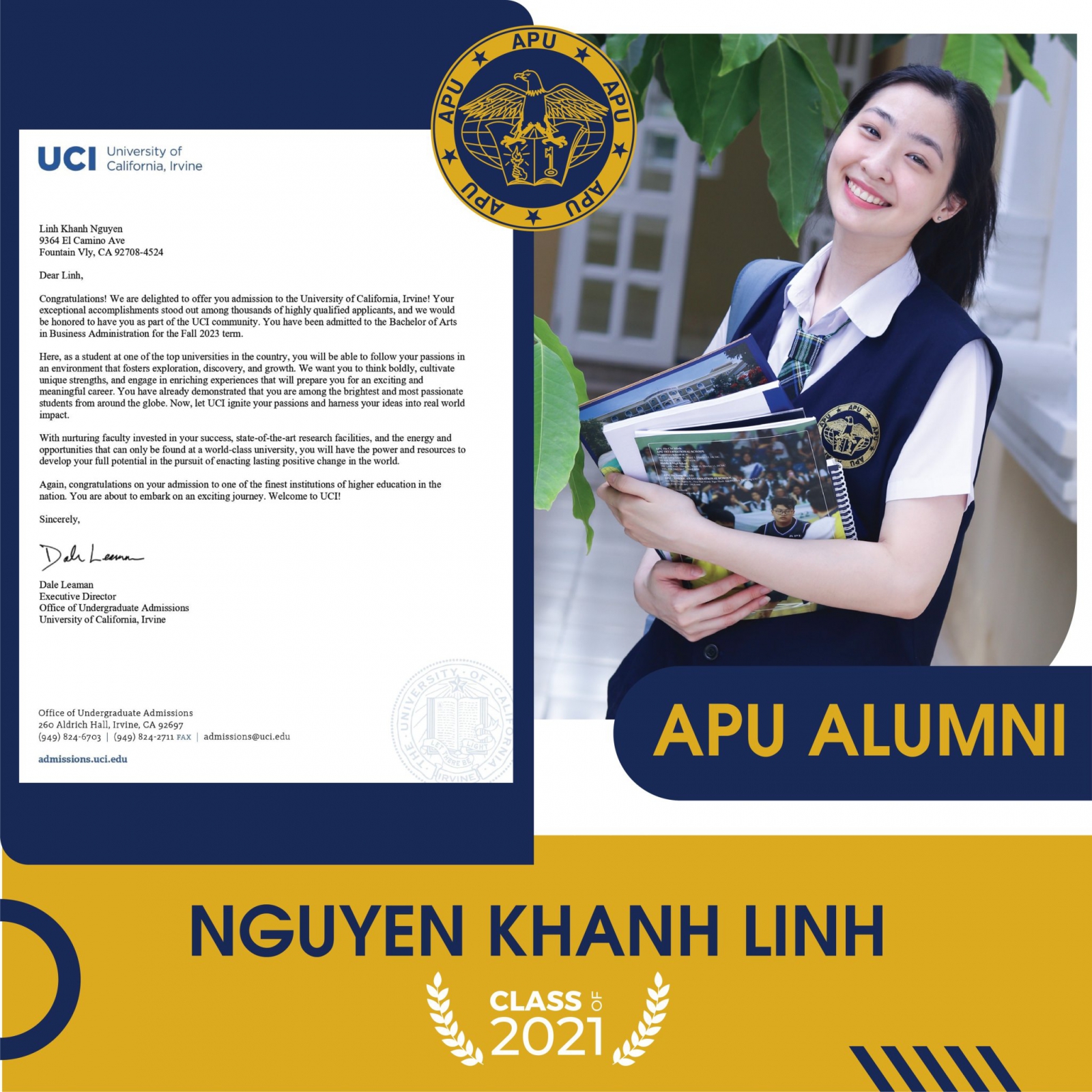 APU는 응우옌 칸 린(Alice) 졸업생이 미국의 상위 10개 공립 대학 중 하나인 캘리포니아 대학교 어바인(UCI)에 합격한 것을 진심으로 축하합니다! UCI는 미국에서 가장 명문 대학 중 하나로 알려져 있으며, 전 세계 학생들의 첫 번째 선택이기도 합니다. 합격률이 30% 미만인 매우 높은 경쟁률을 자랑합니다. 이렇게 명망 있는 대학에 입학 허가서를 받게 된 것은 칸 린의 능력과 APU의 미국식 교육 시스템의 우수성을 다시 한번 증명하는 것입니다. APU 졸업생들은 IELTS/SAT 없이 세계 유수의 대학으로 편입할 수 있습니다. 예를 들어, 미국의 UC Berkeley, UC Davis, UCLA, Boston University, Purdue University, New York University, 캐나다의 University of British Columbia, 호주의 University of Sydney, Australian National University, 한국의 Korea University, Yonsei University 등이 있습니다.