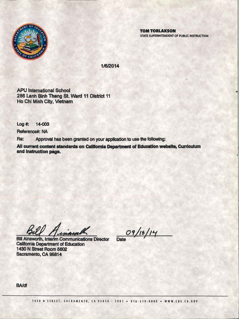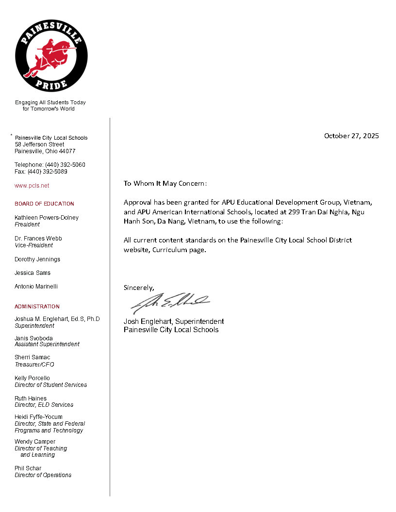 Since its inception in 2004, APU has provided a pathway to US universities by delivering a quality American education in Vietnam. We implement a rigorous curriculum accredited by the California Department of Education, the State of California, USA. In addition, APU’s program is recognized as meeting the academic standards of the State of Ohio and is officially certified by Painesville City Local Schools (Ohio, USA). As one of the first in Vietnam to model this US approach toward learning, we continue to refine our model according to leading research. Please explore the links below to discover our approach and the unique opportunities offered by APU.